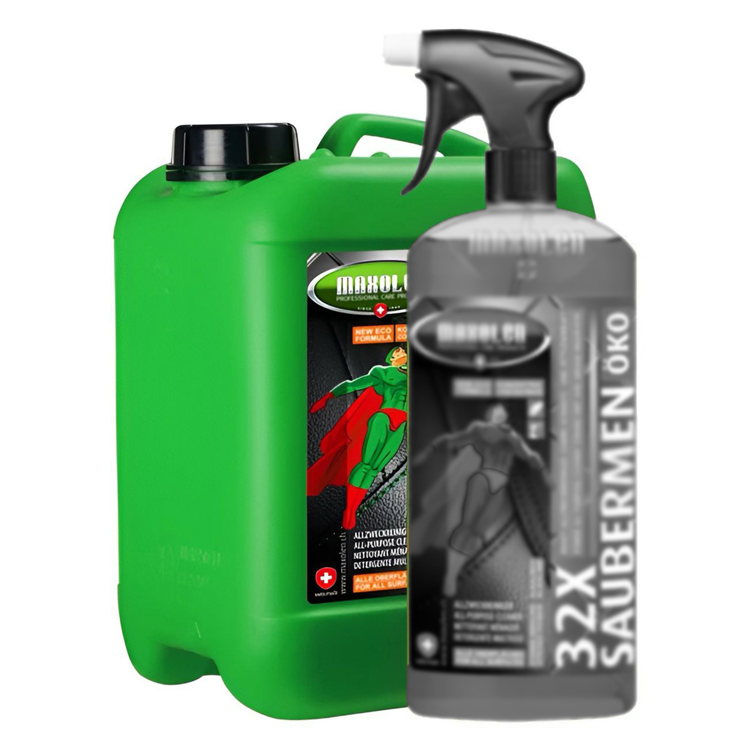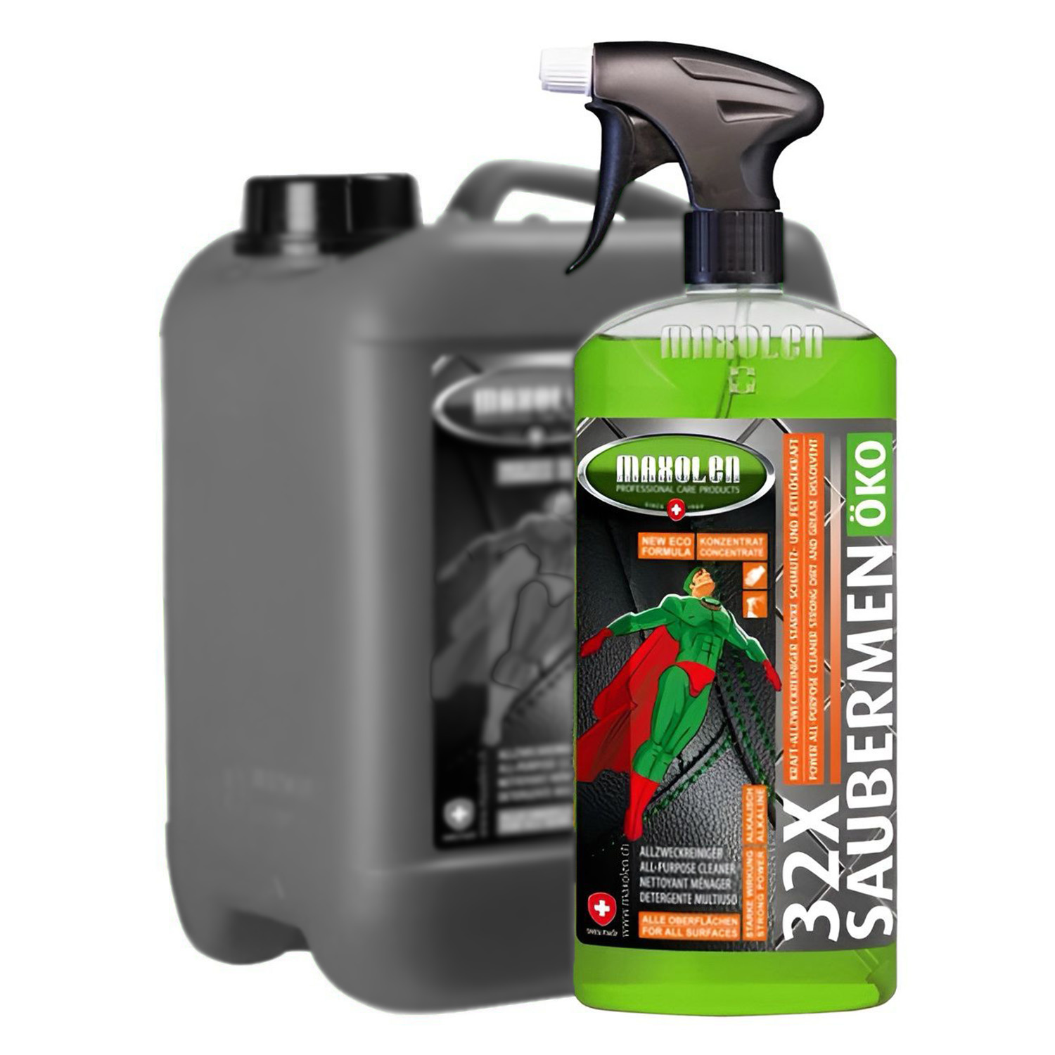 Kraft-Allzweckreiniger Konzentrat mit starker Schmutz- und Fettlösekraft. Saubermen ÖKO 32X ist ein ökoeffizienter Kraft-Allzweckreiniger in konzentrierter Form zur Verdünnung mit zeitgemässer GHS-Einstufung und Wohlfühlduft. Universell zur Entfernung von hartnäckigen Verschmutzungen und Flecken auf allen Oberflächen einsetzbar: Stoffe, Kunststoff, Aluminium, Motoren, Chassis, Felgen, Garagen-Böden und Einrichtungen, Boote, Planen etc.