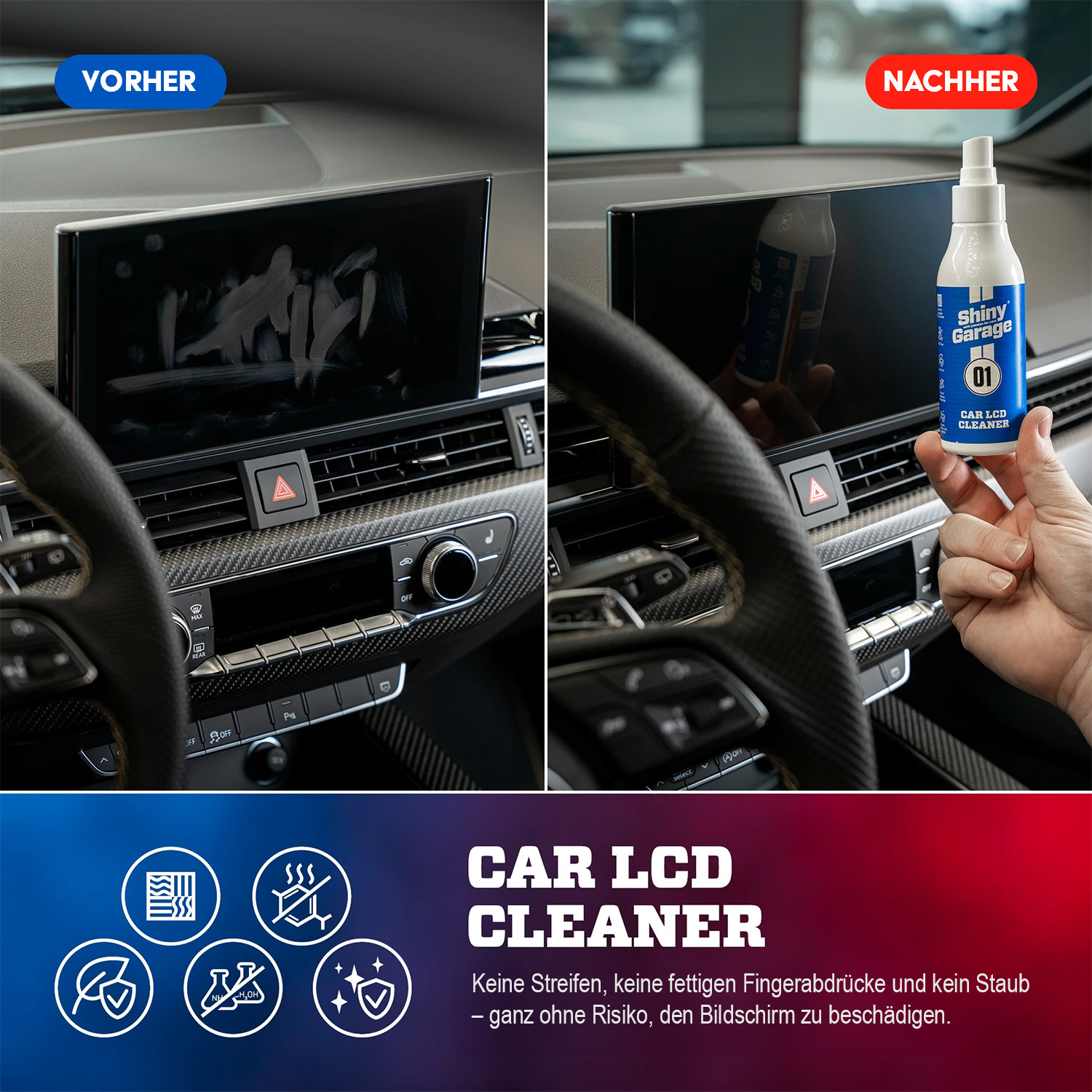 Der Car LCD Cleaner ist die ideale Lösung für die sichere und effektive Reinigung von LCD-Bildschirmen, Touchscreens und Multimedia-Displays in Fahrzeugen. Die moderne, alkoholfreie Formel kommt ohne Ammoniak und Lösungsmittel aus und entfernt Staub, Fingerabdrücke sowie Fettflecken zuverlässig, streifenfrei und ohne das Risiko von Oberflächenschäden.